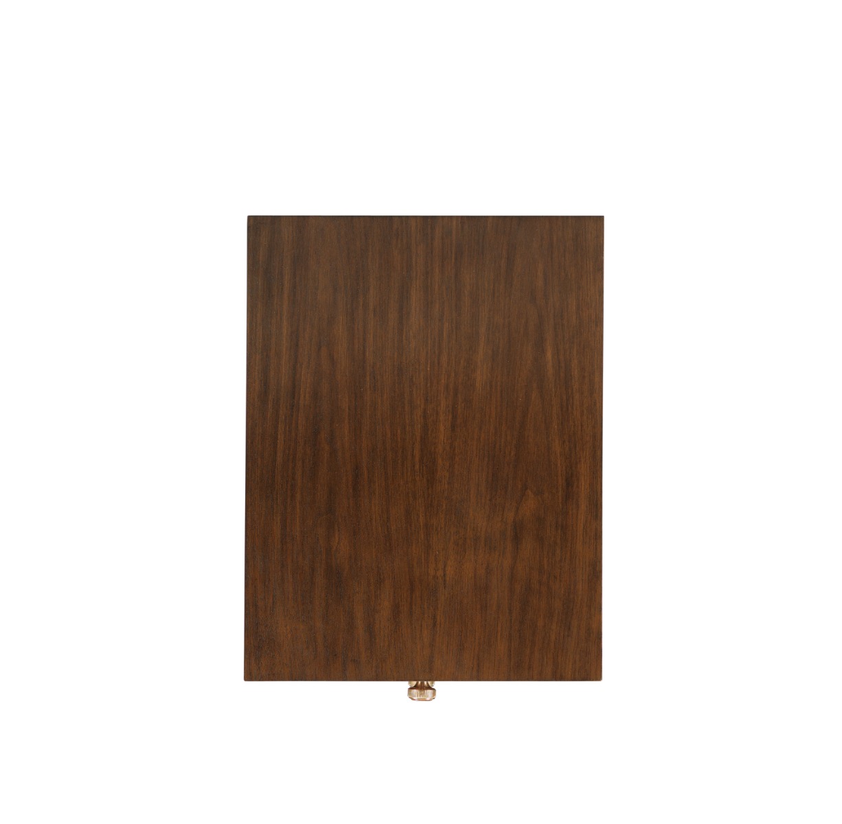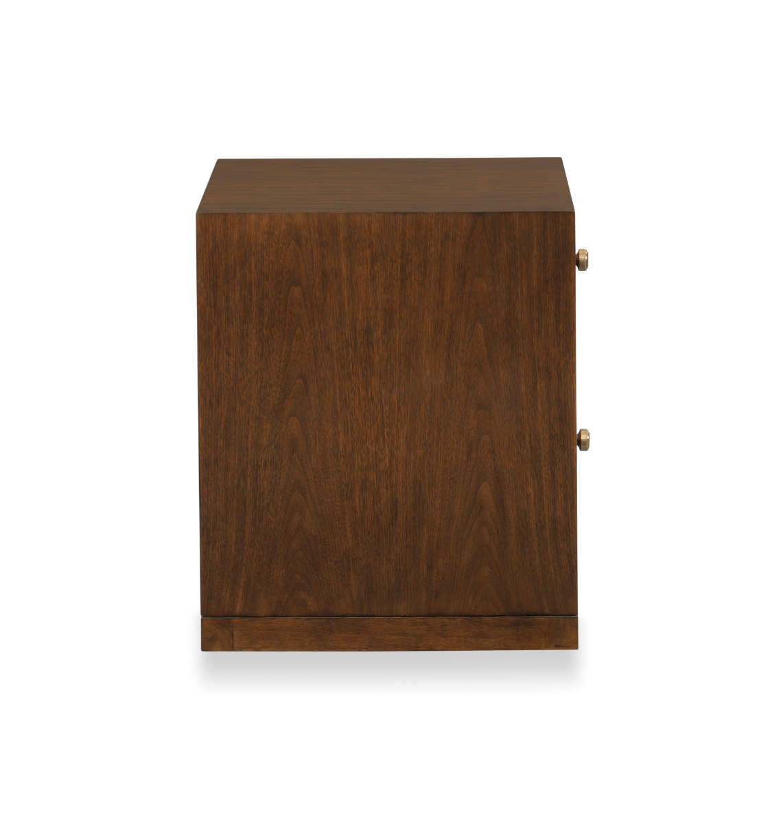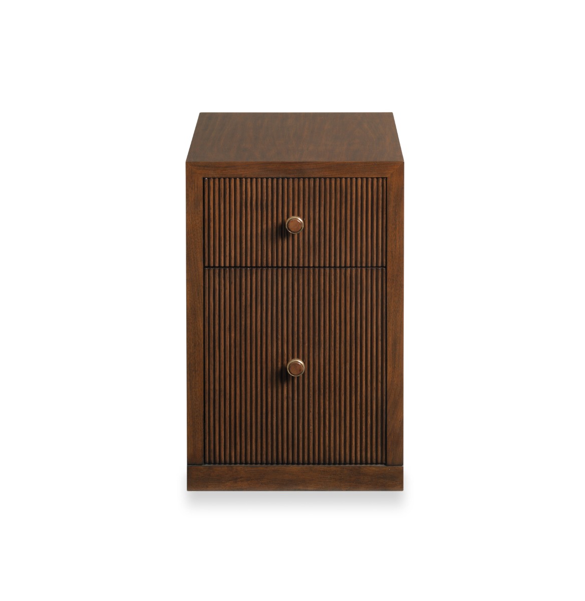 A rectangular top rests over fluted a storage drawer and a lower storage drawer that can hold both legal and letter size files.Material: Hardwood solids & Walnut veneer