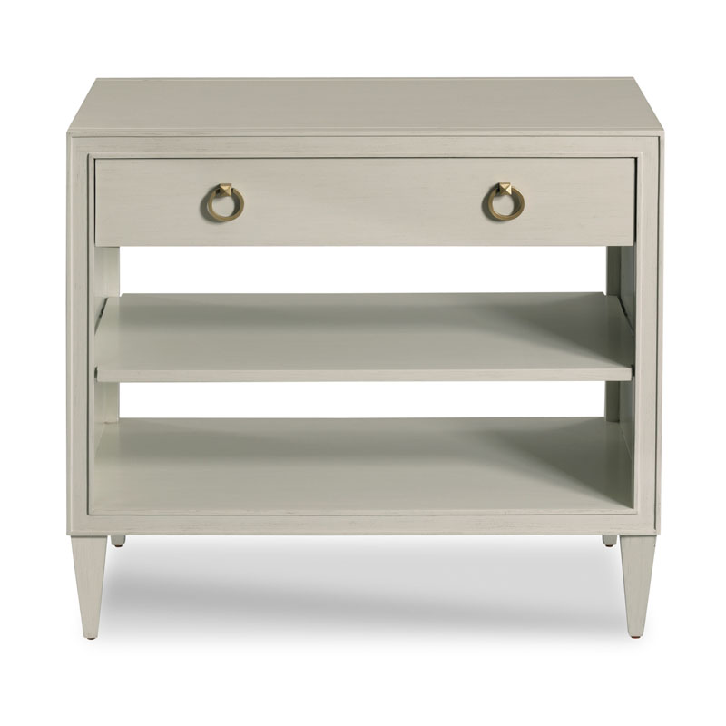A transitionally styled bedside table with a rectangular top over a handy apron rail drawer and an adjustable shelf with no back panel.Material: Hardwood solids