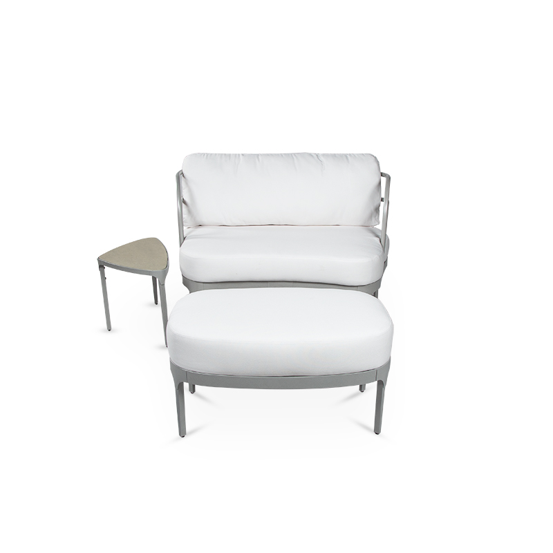 **AVAILABILITY SHOWN IS FOR FRAME ONLY. PLEASE CALL OR EMAIL FOR CUSHION AVAILABILITY** Designed with an art deco style reminiscent of the Roaring Twenties this ottoman fuses symmetry with subtle curvature and a dramatic thick cushion for style and comfort.Material: Textured Aluminum & Quick Dry Reticulated Foam