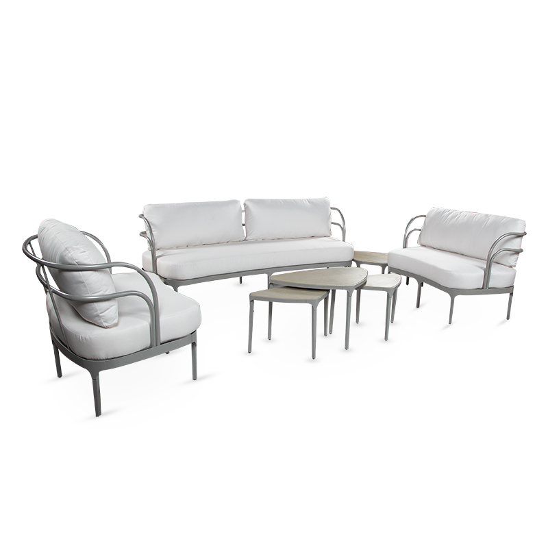 **AVAILABILITY SHOWN IS FOR FRAME ONLY. PLEASE CALL OR EMAIL FOR CUSHION AVAILABILITY** Designed with an art deco style reminiscent of the Roaring Twenties this loveseat fuses symmetry with subtle curvature and a dramatic thick cushion for style and comfort.Material: Textured Aluminum & Quick Dry Reticulated Foam