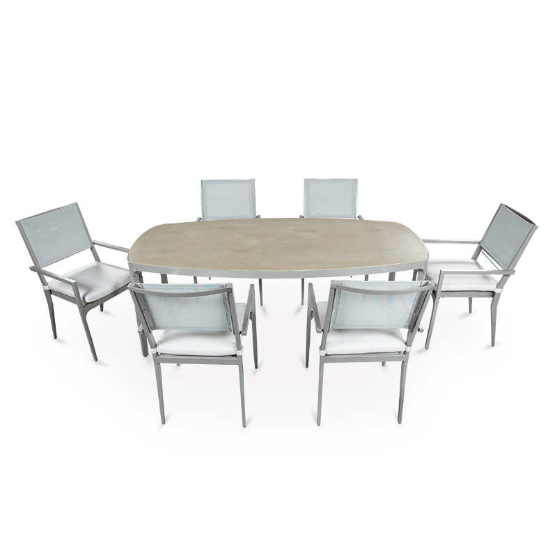 **AVAILABILITY SHOWN IS FOR FRAME ONLY. PLEASE CALL OR EMAIL FOR CUSHION AVAILABILITY***BASE PRICE SHOWN WITHOUT CUSHION - Designed with an art deco style reminiscent of the Roaring Twenties this stacking dining chair is designed with a sling mesh to provide comfort both with or without a cushion.Material: Textured Aluminum & Batyline Sling Fabric