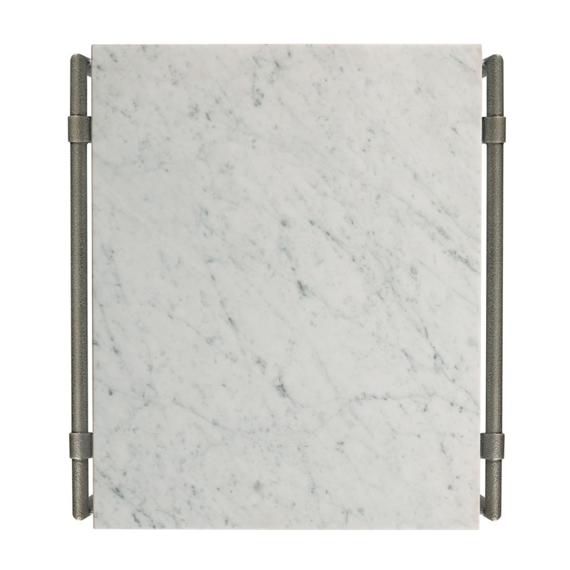 This side table is a testament to contemporary design, combining the natural beauty of honed Carrara marble with the depth and charm of textured metal. Complete with a lower glass shelf for storage and display.Material: Metal, tempered glass, and Honed Carrara Mable