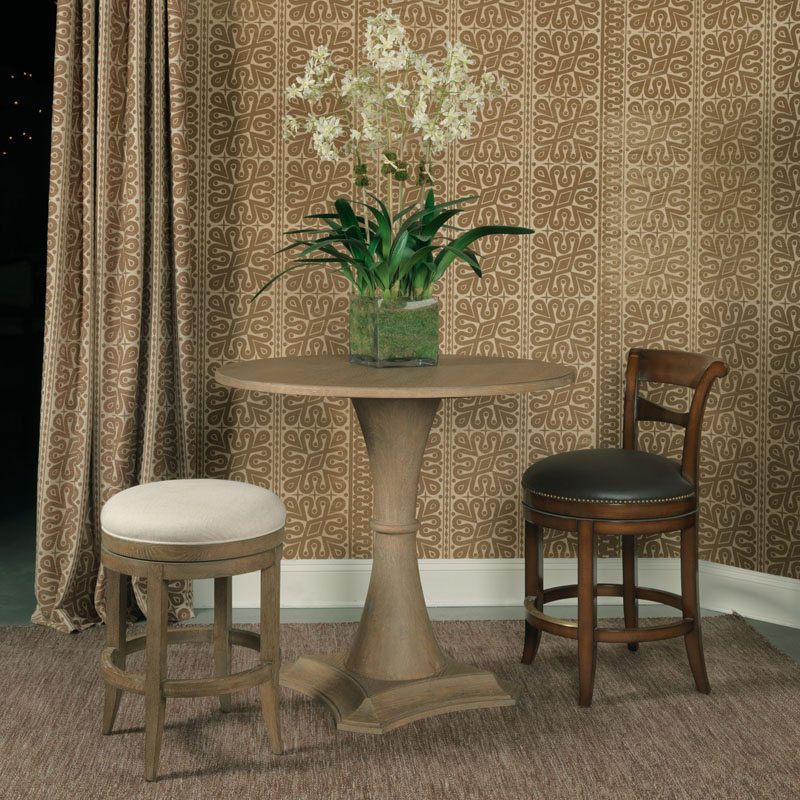A handsome table for high top dining or conversation with a round molded oak top rests over a robust round turned column over a quatrefoil molded base.Material: Hardwood Solids and Oak Veneer
