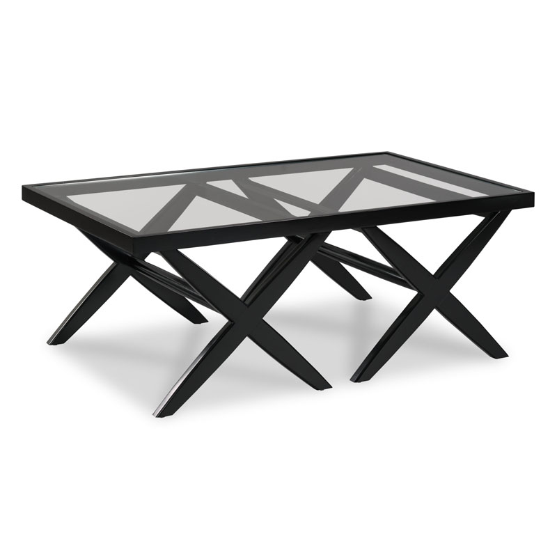 Unique in form, this cocktail table features double X bases joined by a stretcher. Fitted with an inset glass top.Specifications