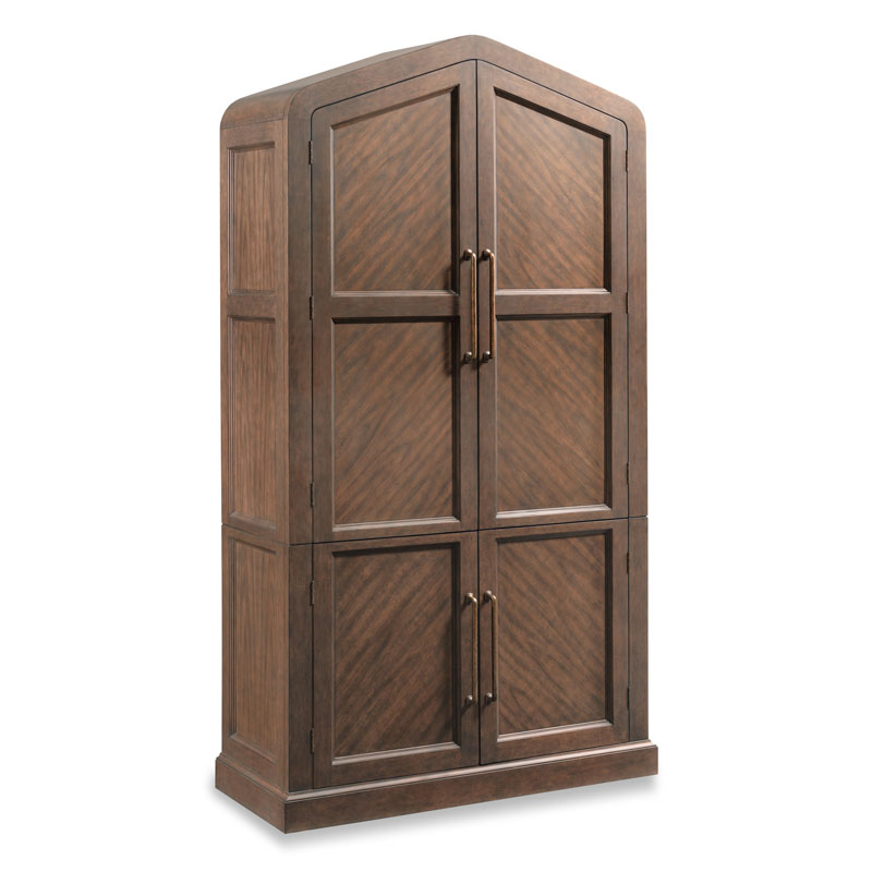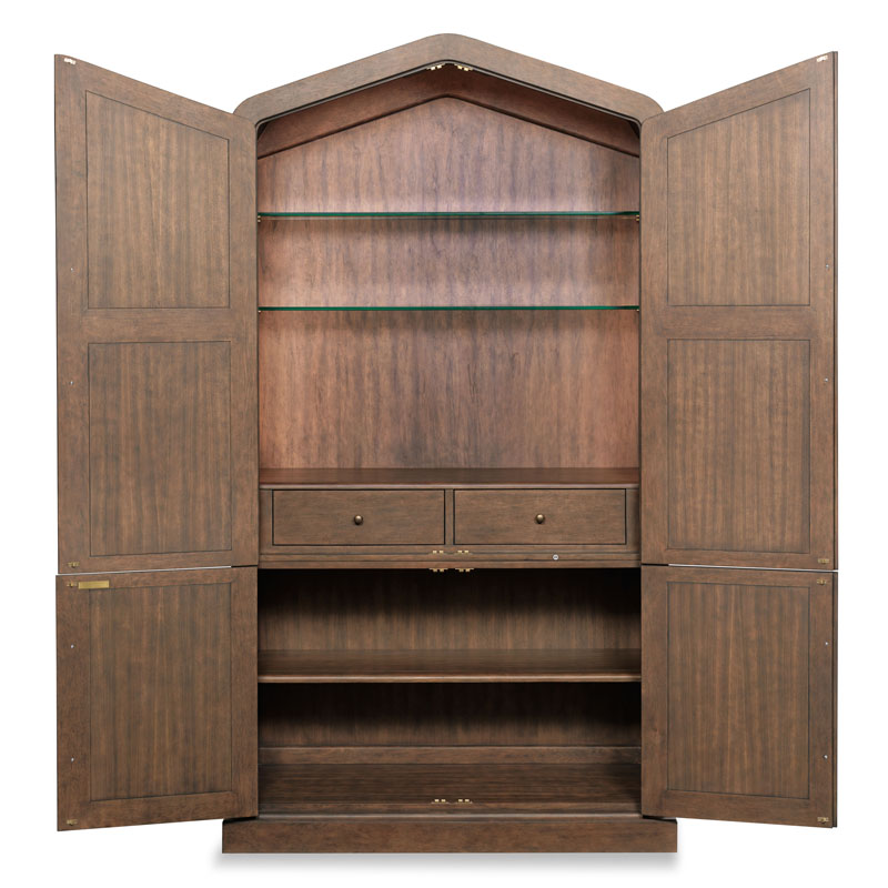 With its elegant arched silhouette, this bar cabinet makes a striking statement in any room. It features adjustable shelves, interior LED lighting and drawers.Material: Walnut solids & veneer, interior lighting, tempered glass
