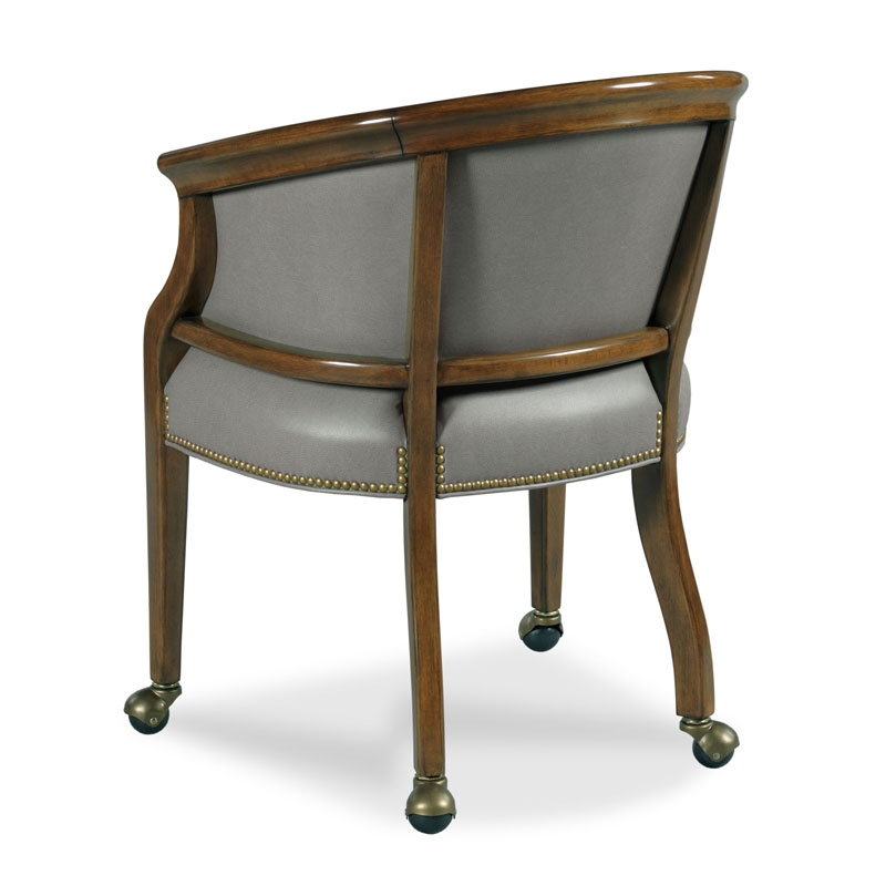 This chair features a curved crest back rail that transitions to sloped arms, making it ideal for use as a game or café chair. The seat and back are upholstered in a standard gray vinyl from Wolf Gordon accented with brass nail head trim. The chair frame is elevated by four casters, allowing for easy and efficient movement.Material: Hardwood Solids