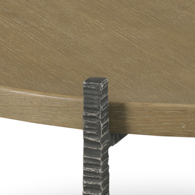 This unique coffee table features a galleried top supported by a textured metal base in blackened metal finish.Material: Oak solids and veneer with metal base