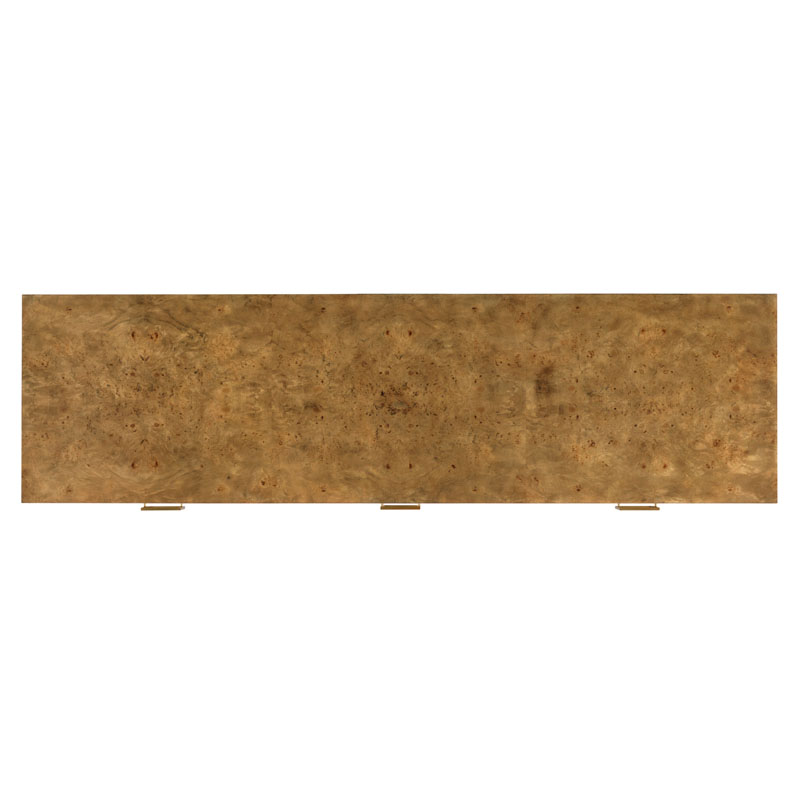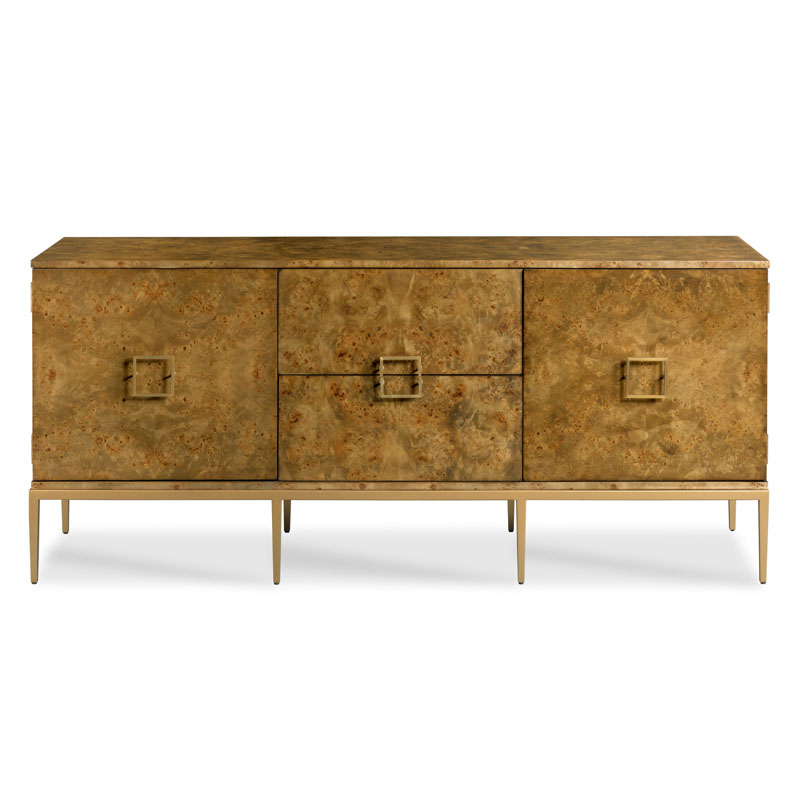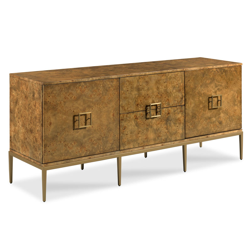 A striking and dramatic cabinet featuring a rectangular top is placed over a pair of doors that hide an adjustable shelf flanking two middle soft close drawers. The cabinet is mounted with squared brass pulls and elevated on a satin brass finish metal base of gracefully tapering legs.Material: Hardwood solids and Natural burl with metal base