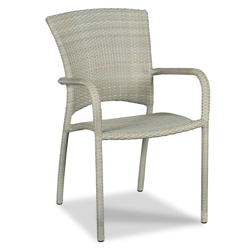 A stylish stackable seat with a curved back and seat flanked by descending curved arms that terminate to rounded woven posts.Material: Powder Coated Aluminum with Handwoven Synthetic Fiber