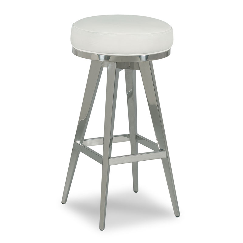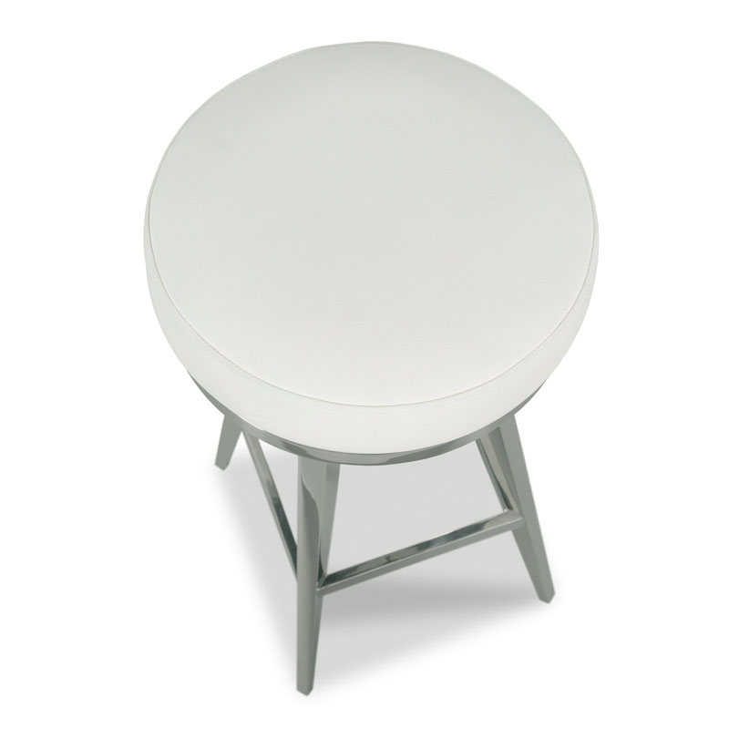 A round upholstered swivel seat rests above tapering posts that are joined by low stretchers.Material: Nickel plated stainless steel