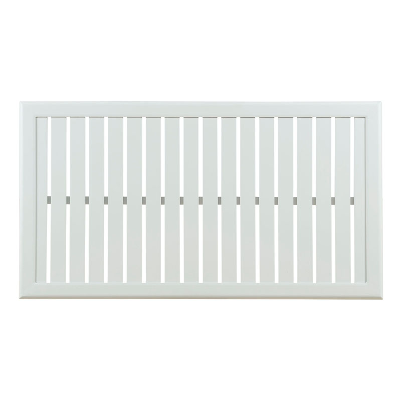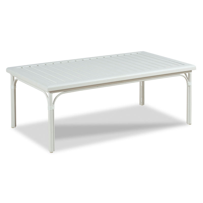 A rectangular slatted top rests over a powder coated aluminum base styled in the fashion of rattan poles that is accented with bindings.Material: Powder Coated Aluminum with Handwoven Synthetic Fiber