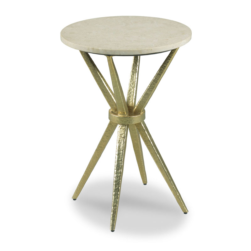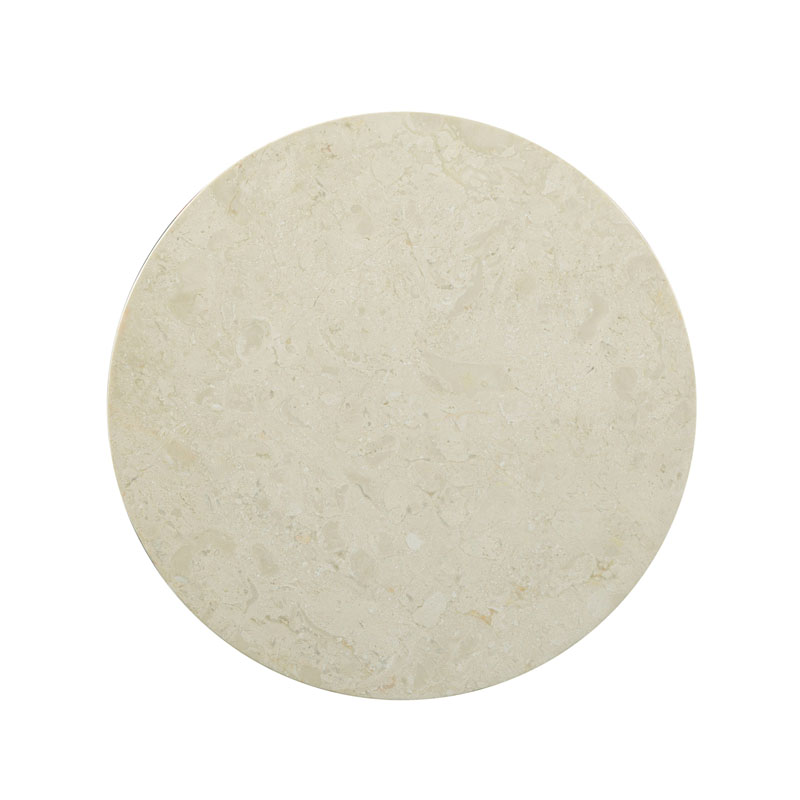 Tapering angular metal legs are joined at the center with a metal ring below a round 5/8" thick top fitted with Spanish marble.Material: Spanish marble top with metal base