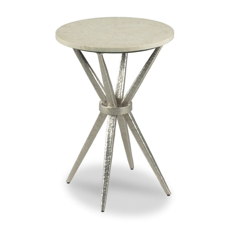 Tapering angular metal legs are joined at the center with a metal ring below a round 5/8" thick top fitted with Spanish marble.Material: Spanish marble top with metal base