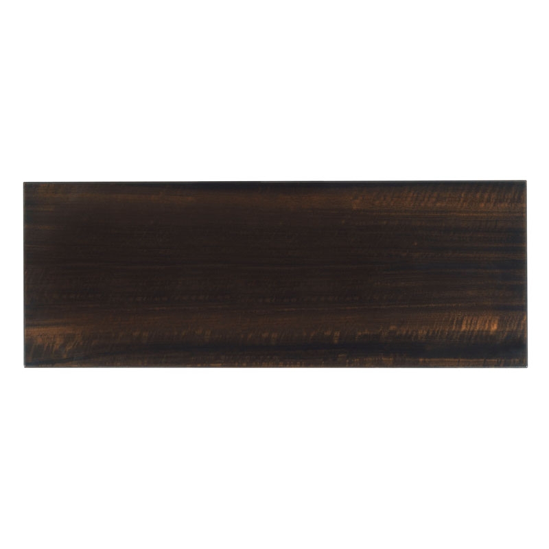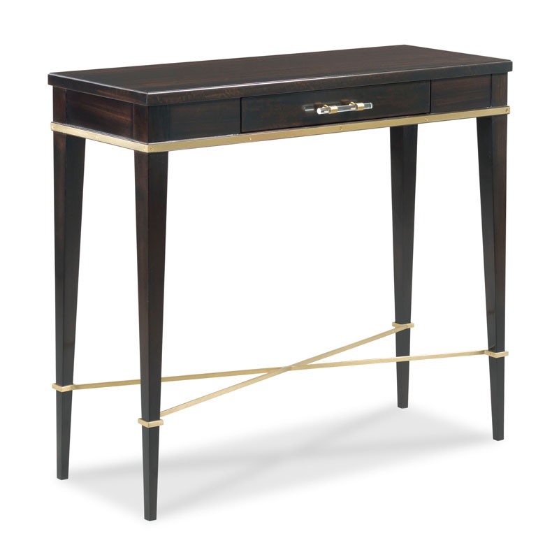 Inspired by the works of Donald Deskey, our hall table has a rectangular top over four gracefully tapering posts that are joined by a low brass stretcher.Material: Hardwood solids and figured eucalyptus veneer