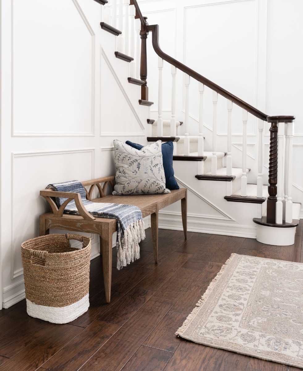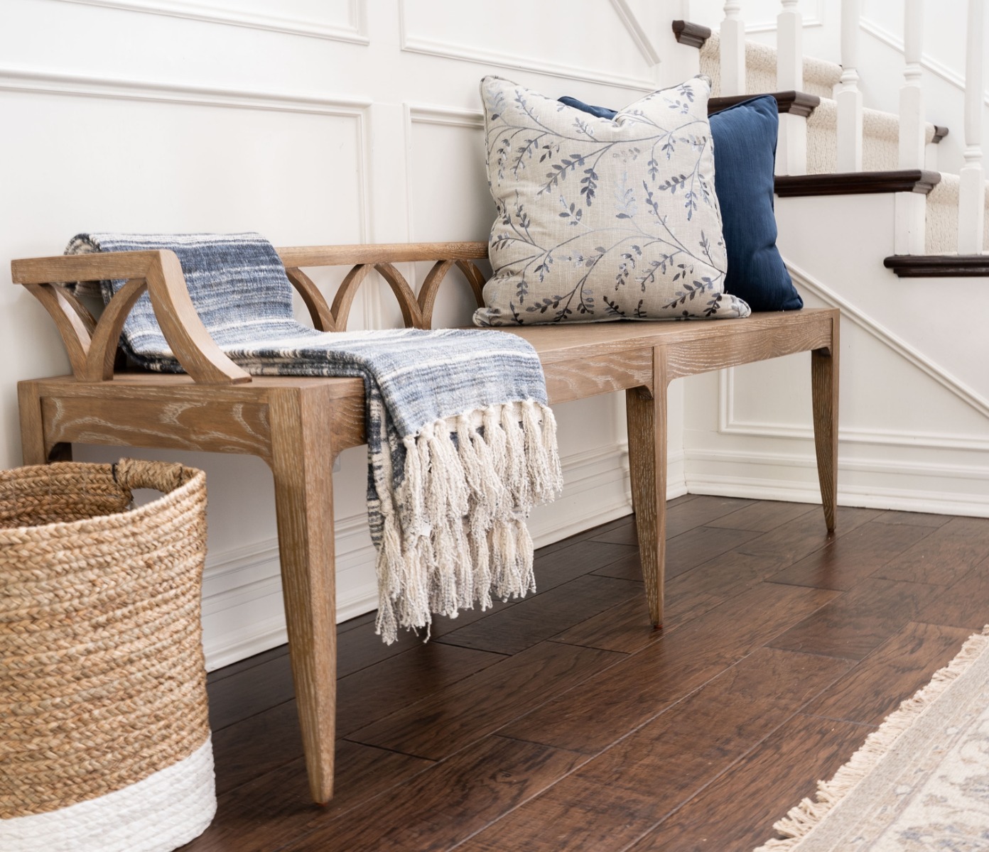A delightful entryway or dining bench with a colonnade of wooden arches above a wood seat that is elevated on gracefully tapering legs. *Optional COM cushion available for an upcharge.**Material: Oak Solids