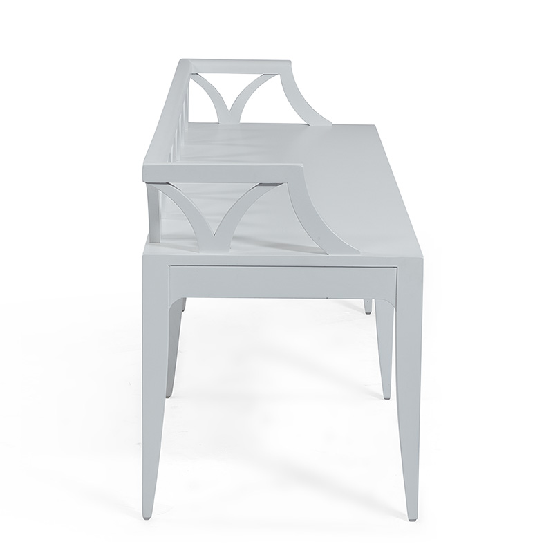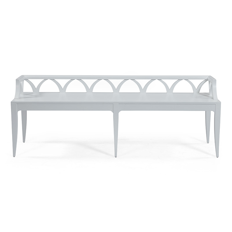A delightful entryway or dining bench with a colonnade of wooden arches above a wood seat that is elevated on gracefully tapering legs. *Optional COM cushion available for an upcharge.**Material: Oak Solids