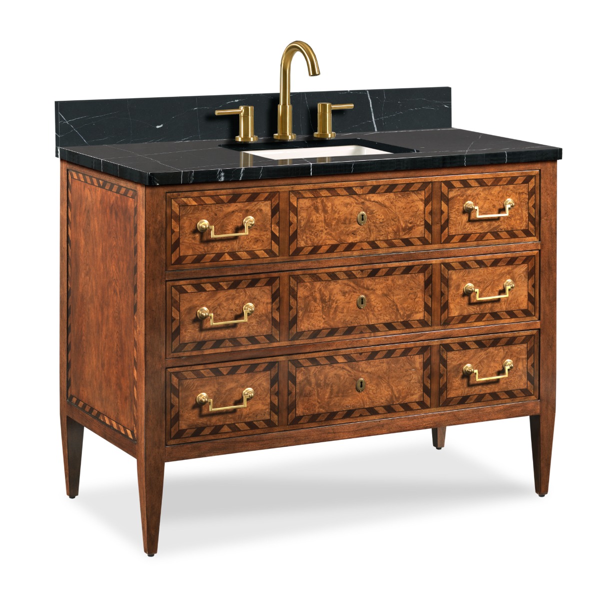A fantastic adaptation from Italian neoclassic originals from the 19th Century. An optional rectangular Black polished marble top rests over two soft close storage drawers veneered with cherry and incised with curious inlays made from ebony and holly. The vanity is elevated on squared tapering posts.