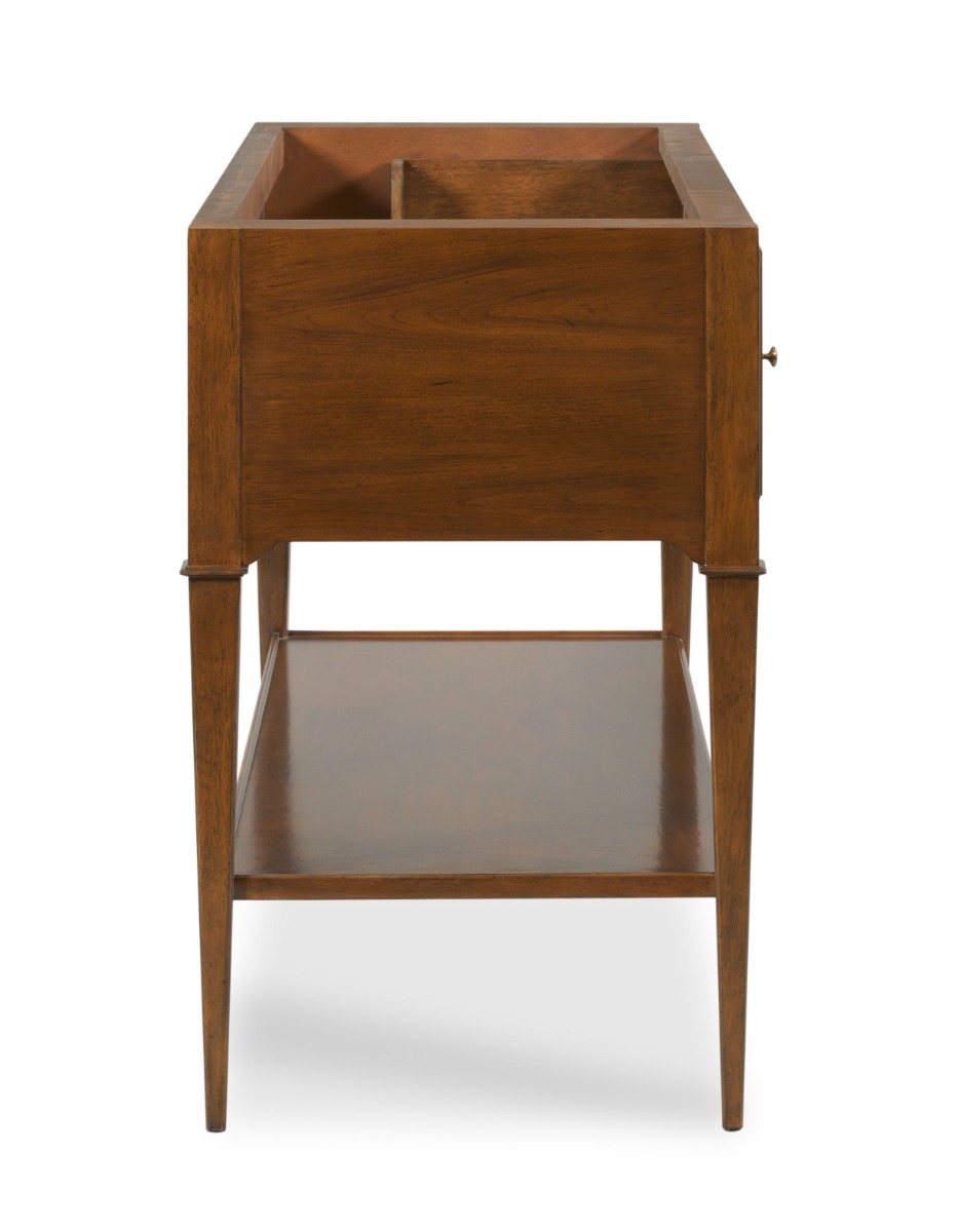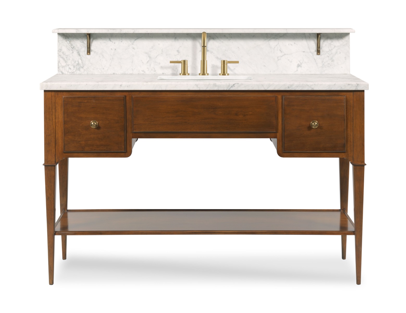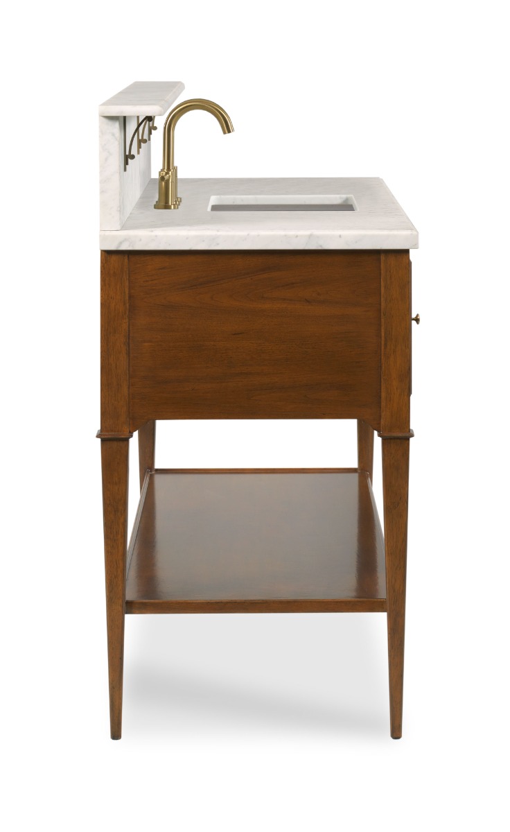 Designed in the spirit of 19th century Italian Neoclassic originals, this wonderful bath vanity has an optional rectangular marble top below a marble shelf supported by pierced brass supports. The apron rail is fitted with storage drawers elevated on tapering posts accented with delicate chamfered details joined by a low shelf.Material: Hardwood solids + carrara marble