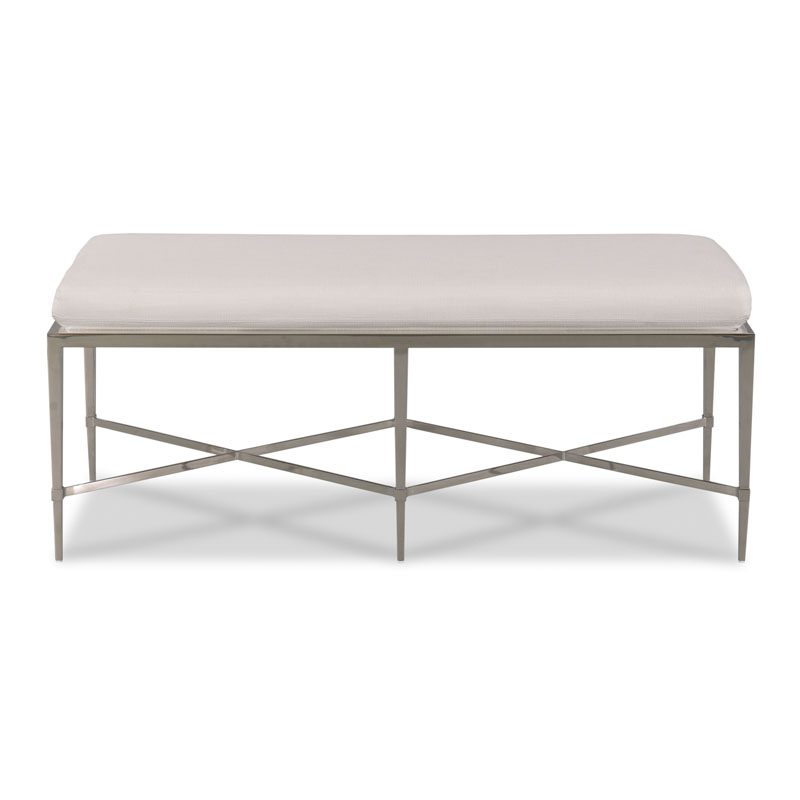 A terrific modern form crafted in metal and finished in polished nickel. A rectangular upholstered cushion rests over six gracefully tapering legs that are joined by low “X” stretchers.Material: Polished stainless steel
