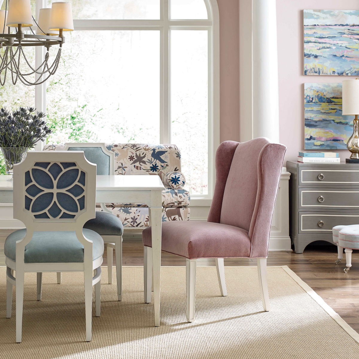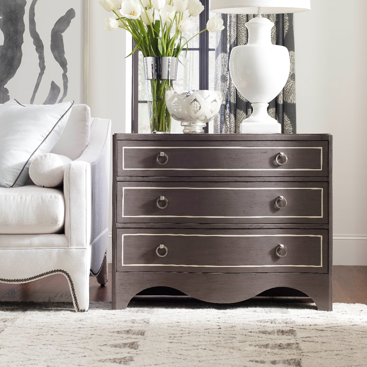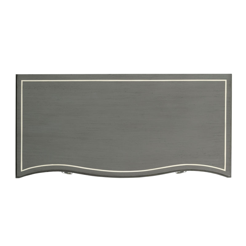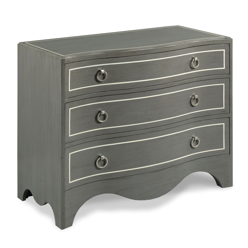 A serpentine chest featuring our Sahara finish with white striping. This chest is French influenced and perfectly scaled as a bedside or side table in a living room setting.Material: Hardwood solids