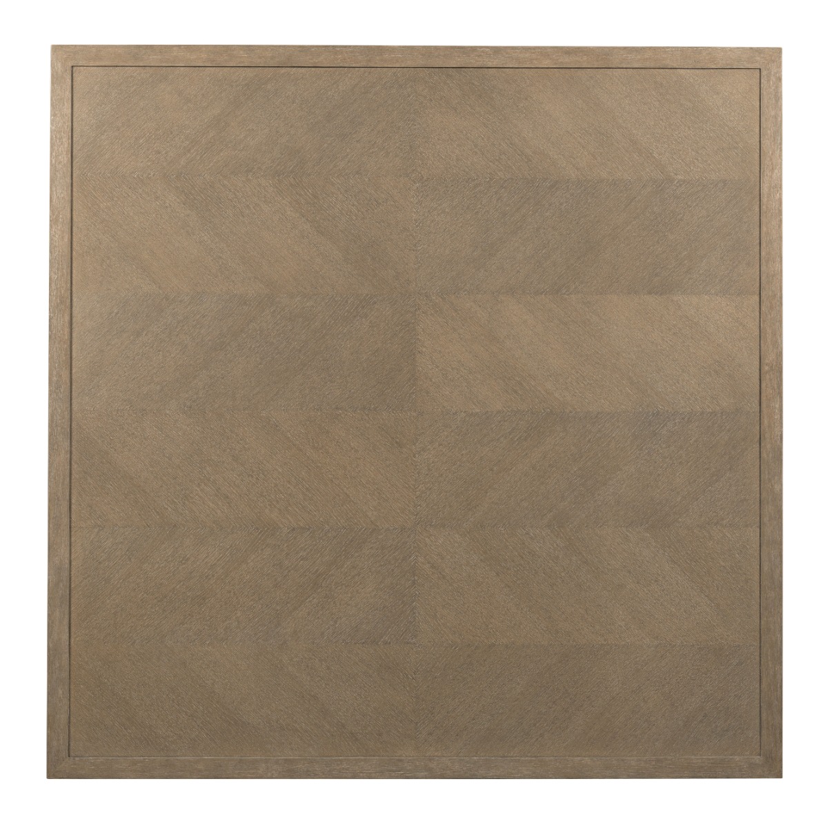 A handsome low table designed with modern sensibilities has a squared top that is fielded with a herringbone veneered pattern. The top is elevated on squared tapering posts that terminates to brass ferrules. The legs are joined by a low shelf.Material: oak solids and veneer