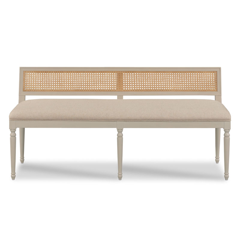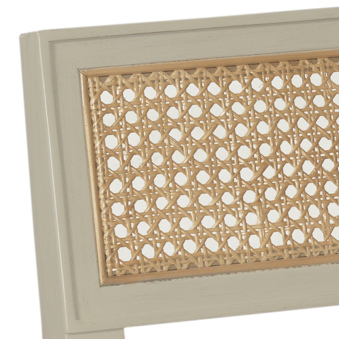 A lovely seat inspired by 18th Century Louis XVI French originals with an upholstered seat that is elevated on six gracefully tapering turned legs below an angled back frame that is fitted with natural open cane.Material: Hardwood solids with naturalcane