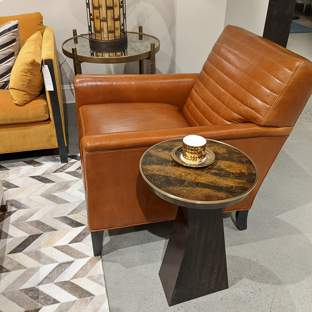 A terrific small table for drinks, with a rounded eucalyptus veneered top over an angular patterned architectural support column.Material: Hardwood solids with figured eucalyptus veneer and faux tortoise top with brass trim