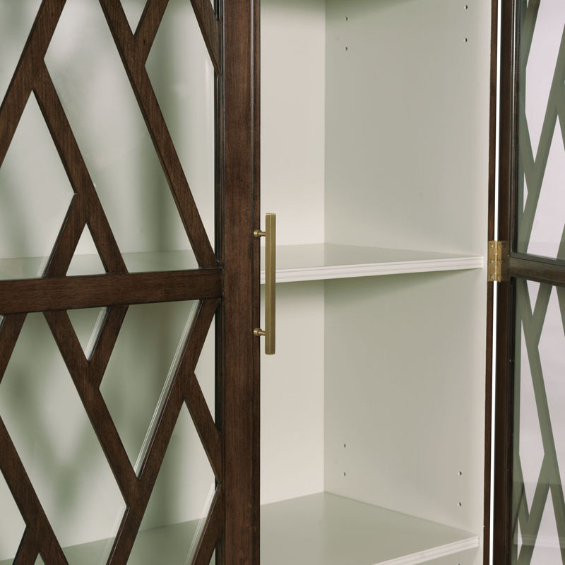 A striking Display Cabinet featuring a pierced fretwork overlaid on glass doors with refined brass pulls.Material: Hardwood solids and walnut veneer