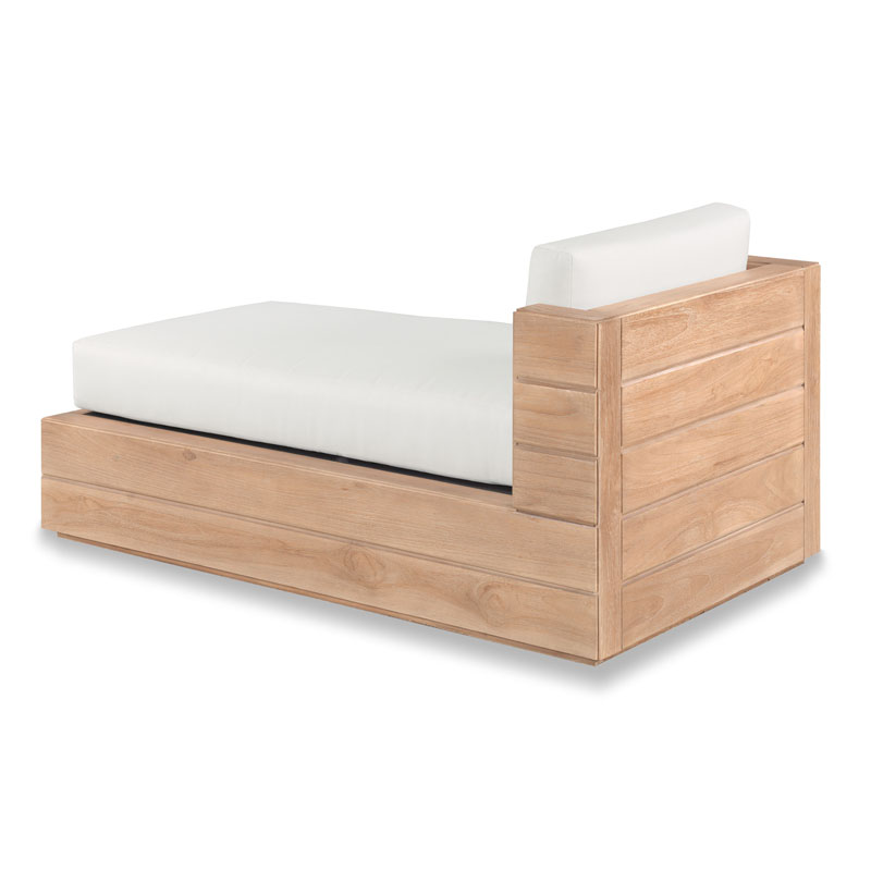 **AVAILABILITY SHOWN IS FOR FRAME ONLY. PLEASE CALL OR EMAIL FOR CUSHION AVAILABILITY** A cubist outdoor chaise crafted from teak solids fitted with loose upholstered back and seat cushions.Material: Teak