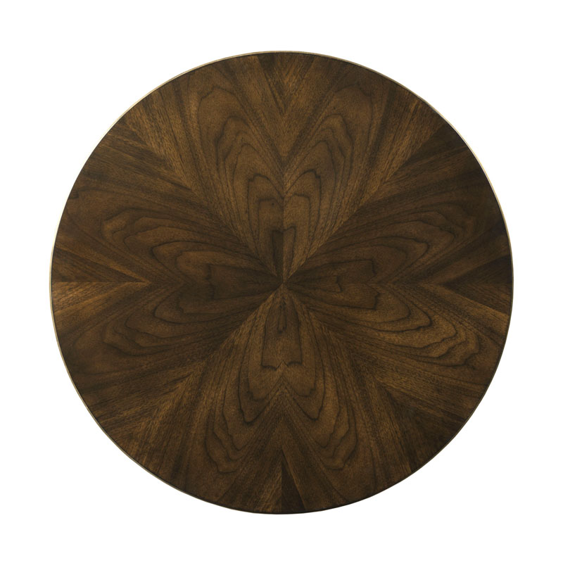A round top is surrounded by a brass gallery over four tapering legs that are joined by a low round shelf. Crafted from hardwood solids and walnut veneer.Material: Hardwood solids and walnut veneer