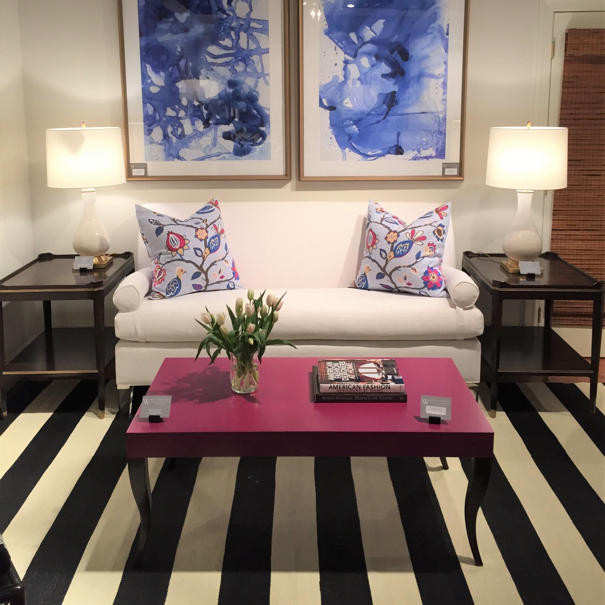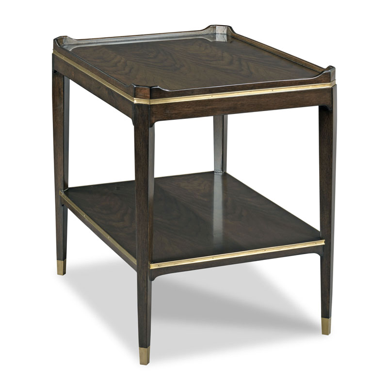A rectangular galleried top is raised by canted squared tapering corner posts that are joined by a low shelf. The table is accented by brass overlays and sabots.Material: Hardwood solids and walnut veneer