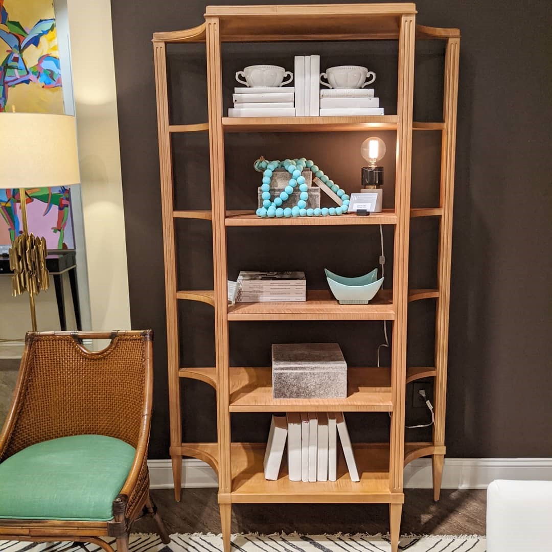 A graceful bookshelf with classical styling from the 18th Century. The case has squared fluted posts that hold five shelves.Material: Acacia solids and cherry veneer