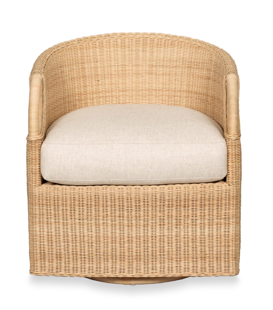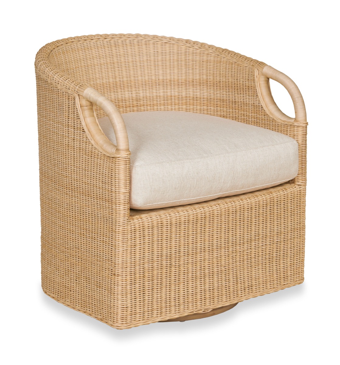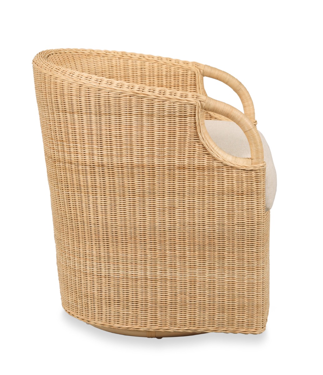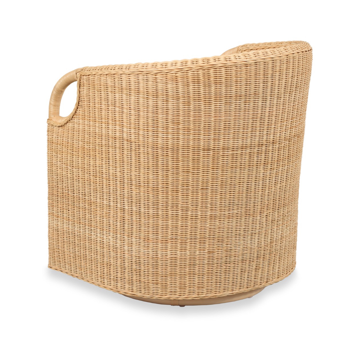 A wonderful lounge chair with a barrel back design crafted from natural rattan that is fitted with a loose cushioned back over an ample upholstered seat cushion over a swivel base.Material: Natural Rattan