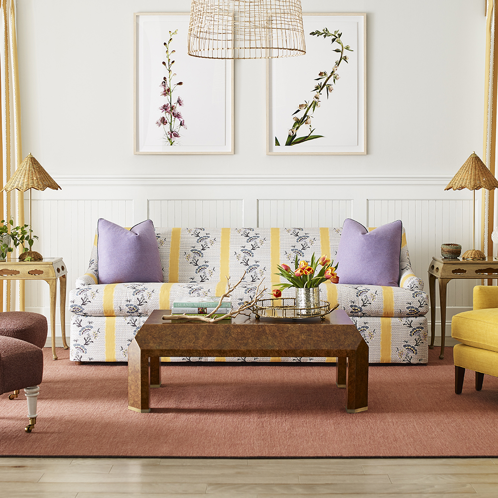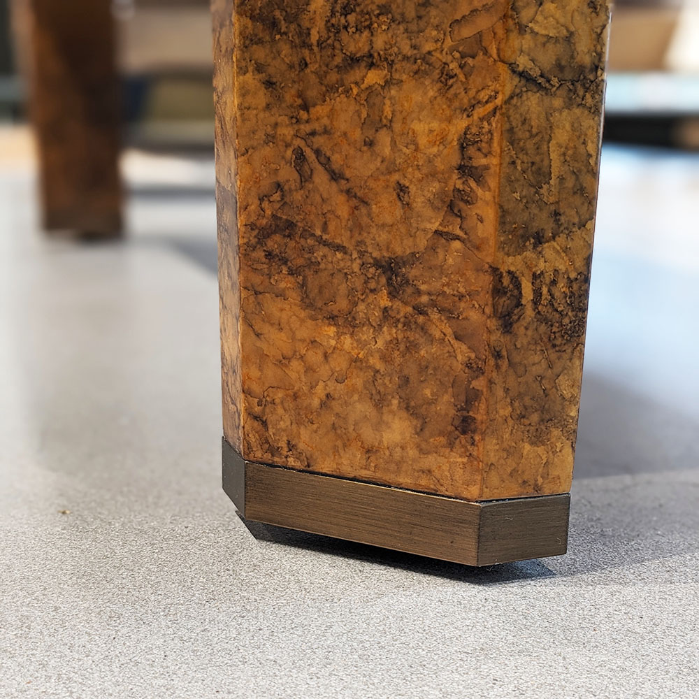 A curious design with a myriad of geometric shapes forms this terrific low table with a rectangular top that is elevated on triangular legs with brass ferrules.Material: Hardwood solids and MDF