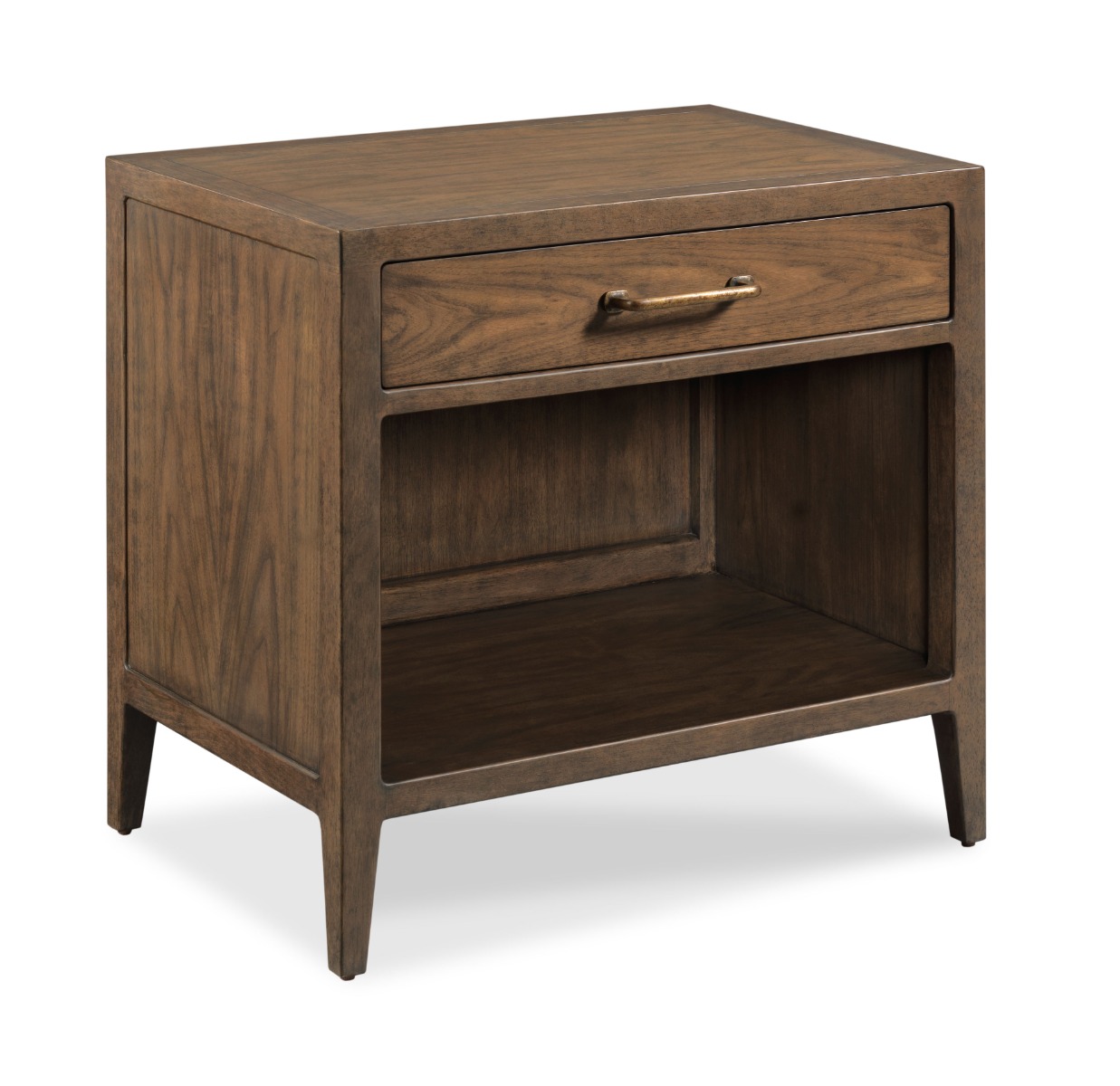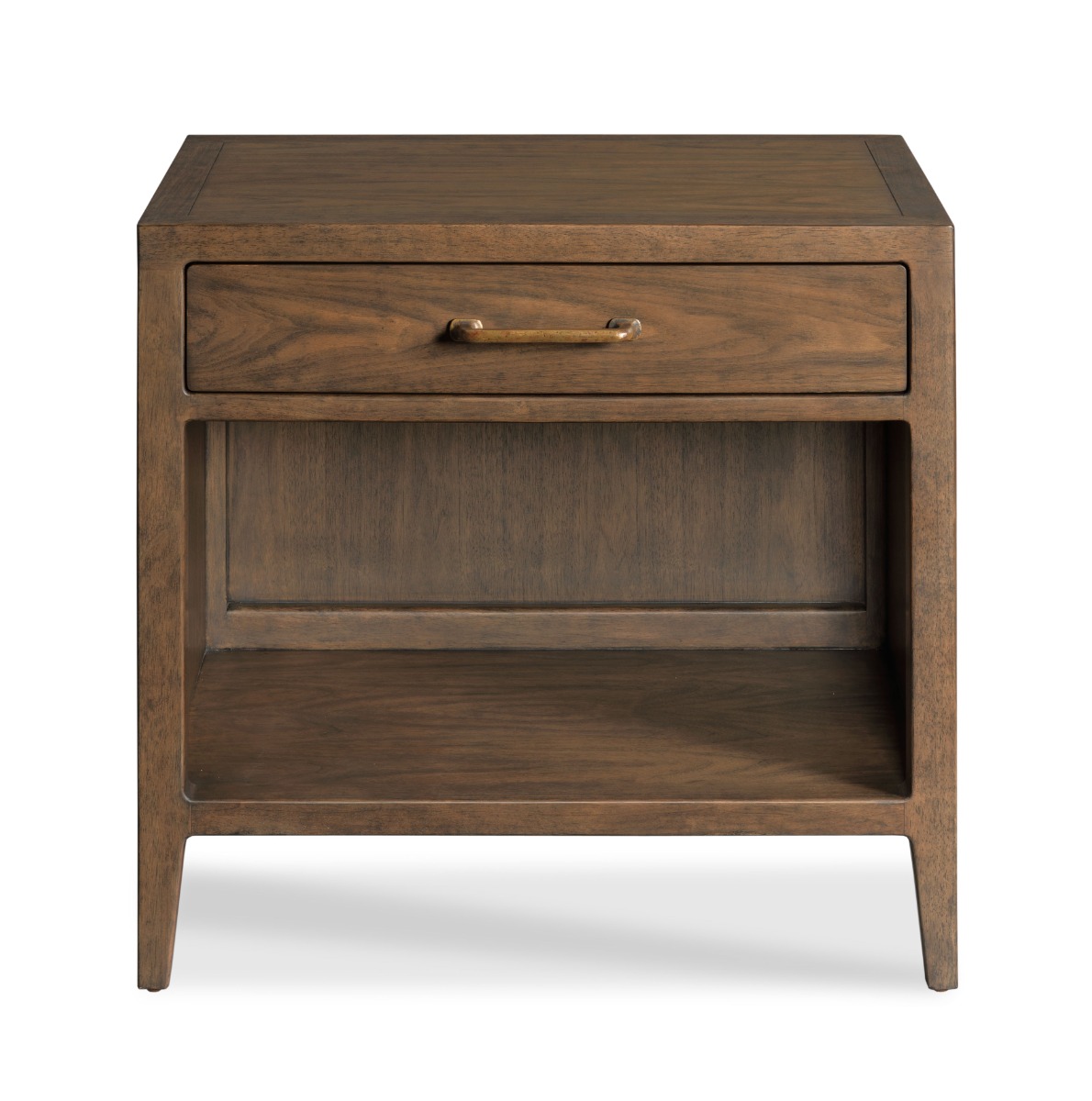 A rectangular top is placed over squared corner posts that flank a handy drawer over an open storage area and low shelf.Material: Hardwood solids & Walnut veneer