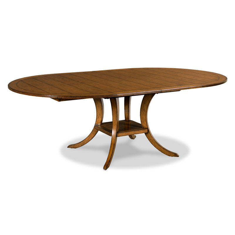 A wonderful table for dining with a round top that divides at its center to accommodate 2-18” fillers. The table is elevated on ample sable legs that are joined by a low square shelf.Material: Hardwood solids & flat cut cherry veneer