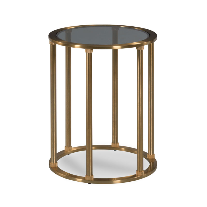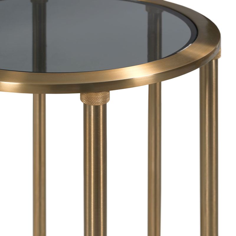 This elegant table has a round inset tinted glass top elevated by six rounded support posts over an round ring base.Material: Stainless steel and tempered glass