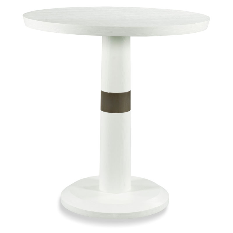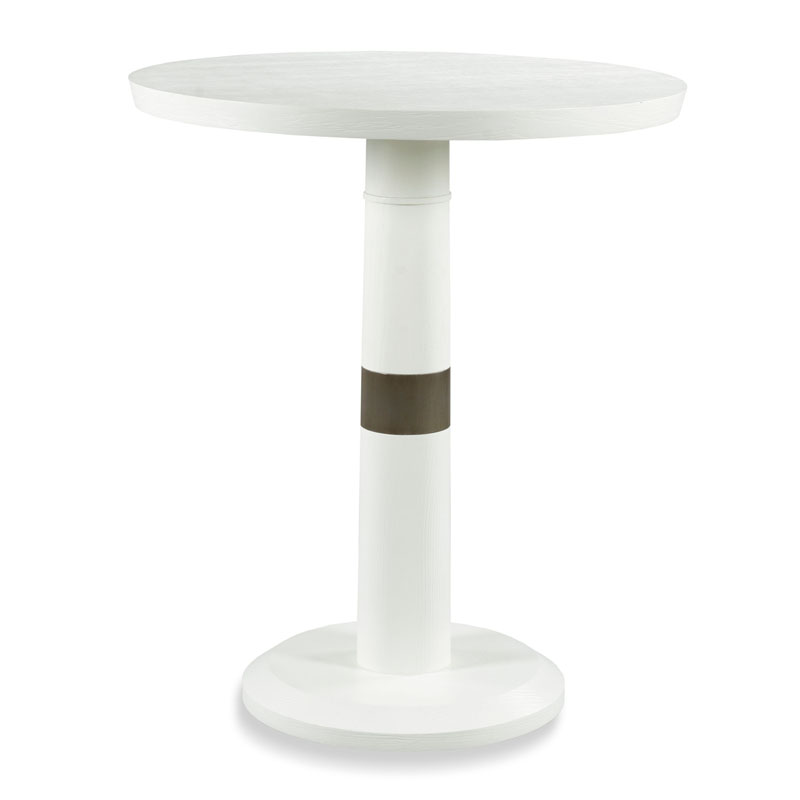 The highlight of this pub table is the metal band centered in the column. The platform base is recessed in the center and is beveled as it flows to the floor. It is veneered in quartered oak and offers the dual height option of 36.5" H (Counter) or 42.5" H (Bar).Material: Hardwood solids and nickel trim