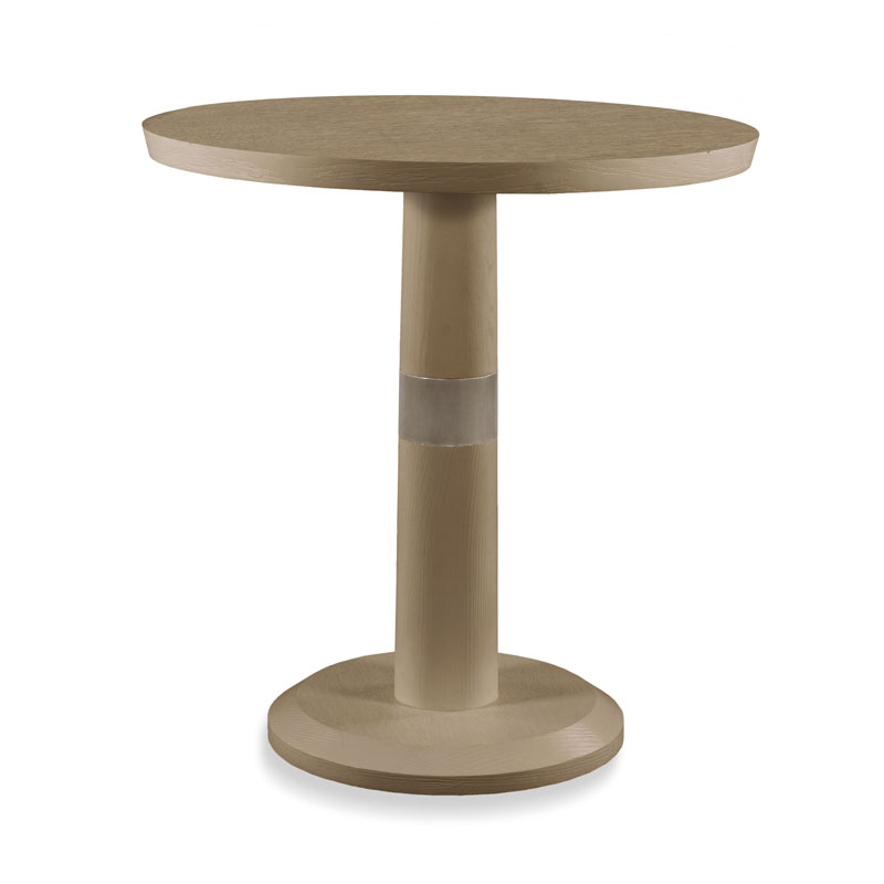 The highlight of this pub table is the metal band centered in the column. The platform base is recessed in the center and is beveled as it flows to the floor. It is veneered in quartered oak and offers the dual height option of 36.5" H (Counter) or 42.5" H (Bar).Material: Oak solids and veneer