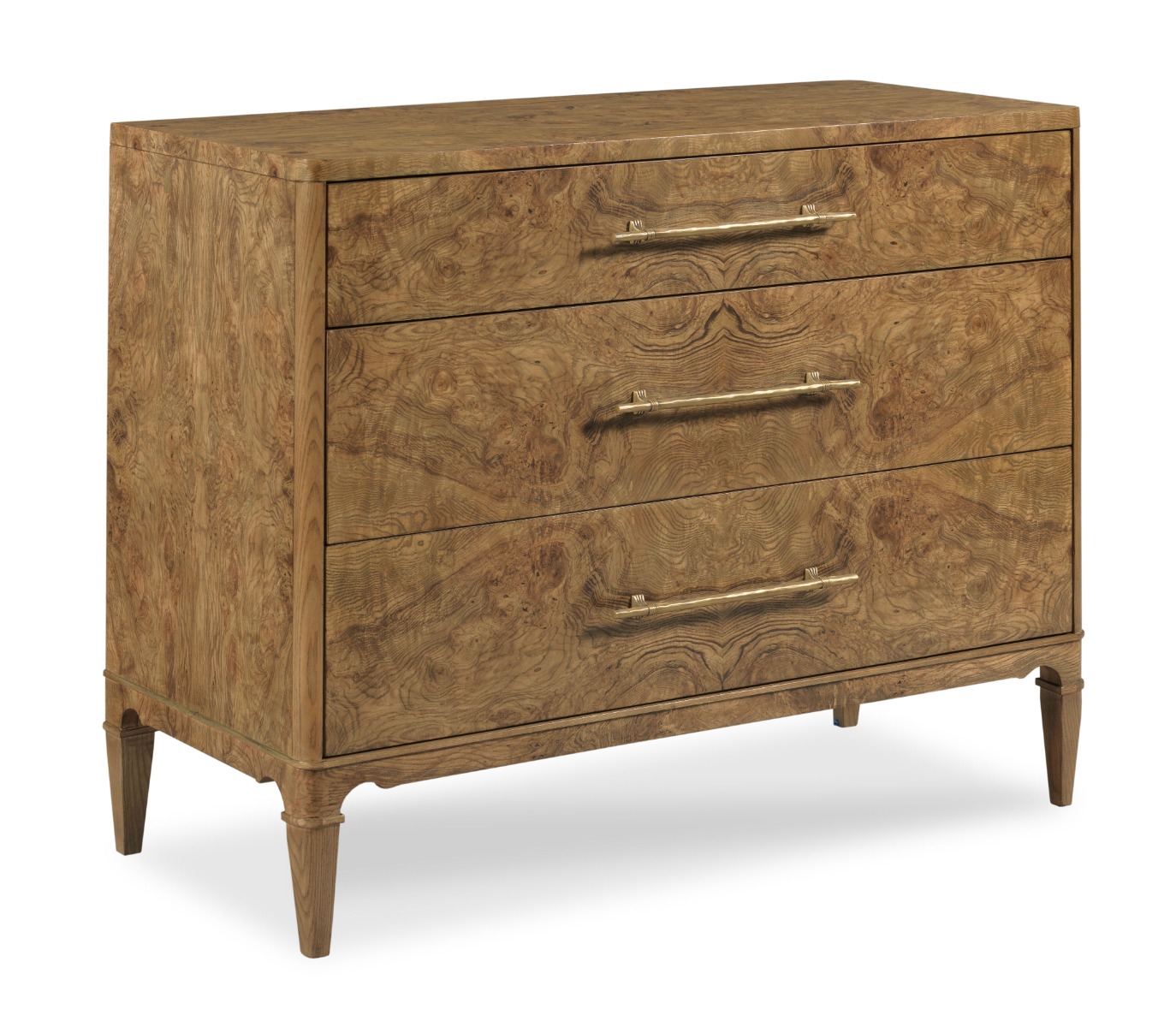 A stylish chest with a rectangular top over three storage drawers elevated on tapering legs.Material: Hardwood solids & Olive Ash Burl veneer