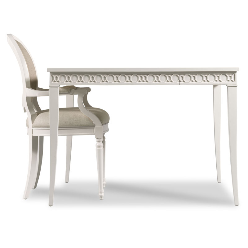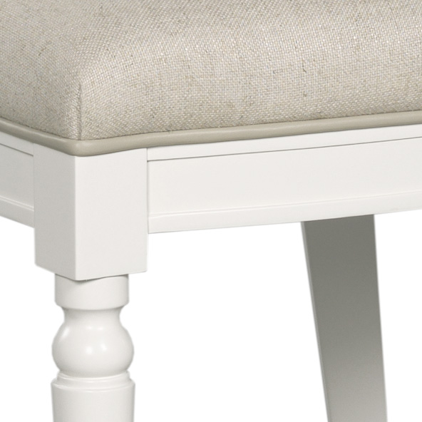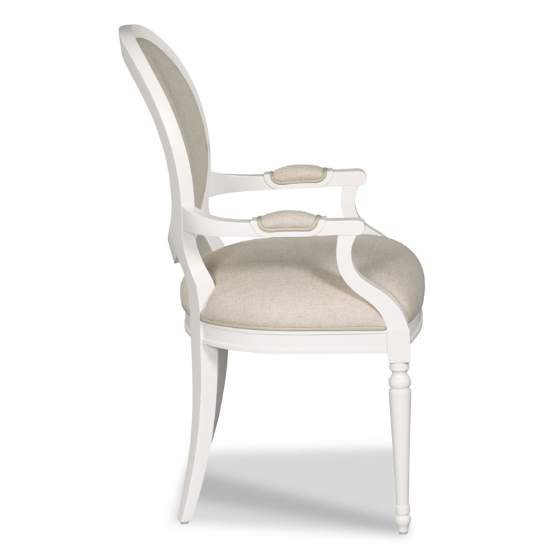 This chair features a round shaped upholstered back over an upholstered seat with contrast welt.Material: Beech solids