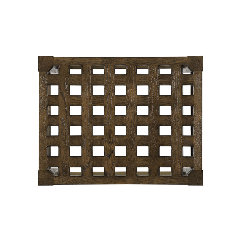 A curved, pierced lattice work seat is raised by splayed, tapering legs that are joined by a box stretcher.Material: Oak solids