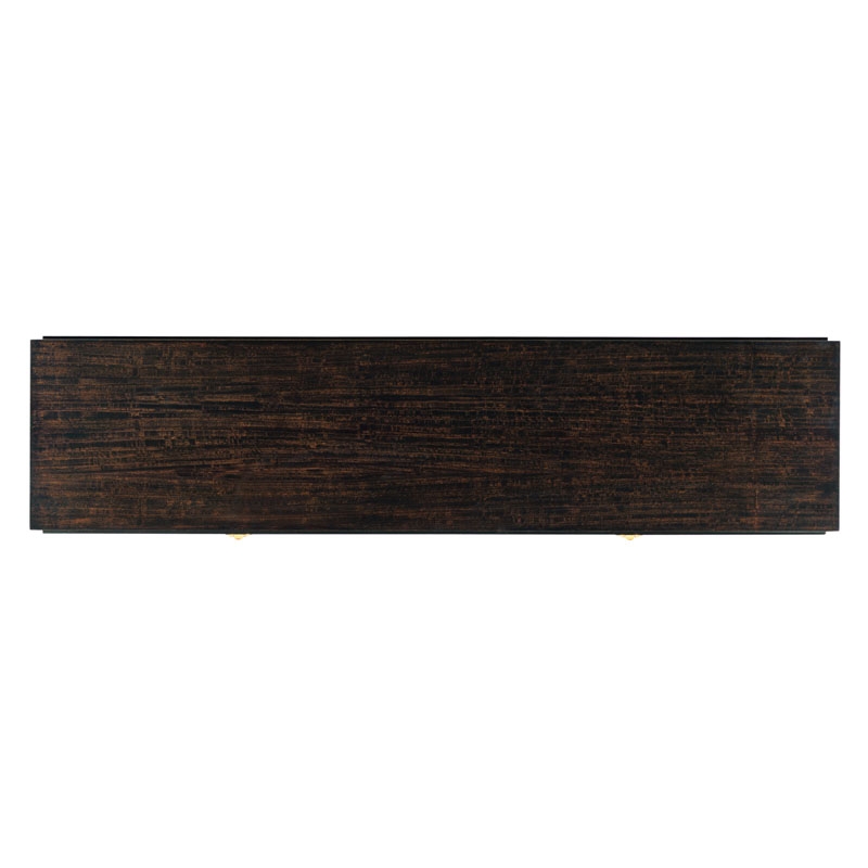 A rectangular top veneered in figured eucalyptus is placed over four individual drawers that are mounted with brushed brass ring pulls.Material: Hardwood solids and figured eucalyptus veneer