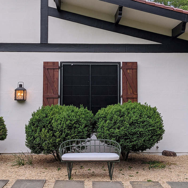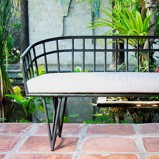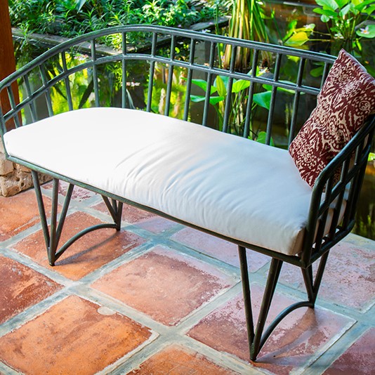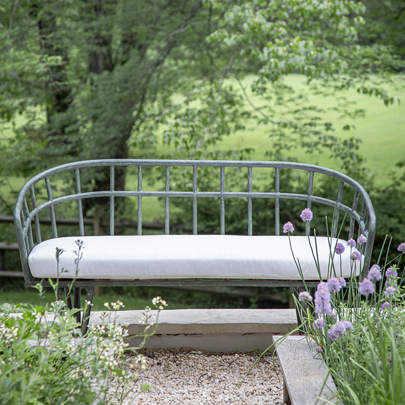 **AVAILABILITY SHOWN IS FOR FRAME ONLY. PLEASE CALL OR EMAIL FOR CUSHION AVAILABILITY** A charming bench for outdoor seating with a curved back over a colonnade of round spindles above an upholstered seat cushion that is elevated on metal legs.Material: Iron
