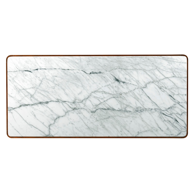 A lovely low table, styled in the spirit of mid 20th century modern works of the likes of Nelson and Eames. Tapering rounded legs are joined by delicate apron rails below an inset carrara marble top.Material: Hardwood Solids and Carrara Marble