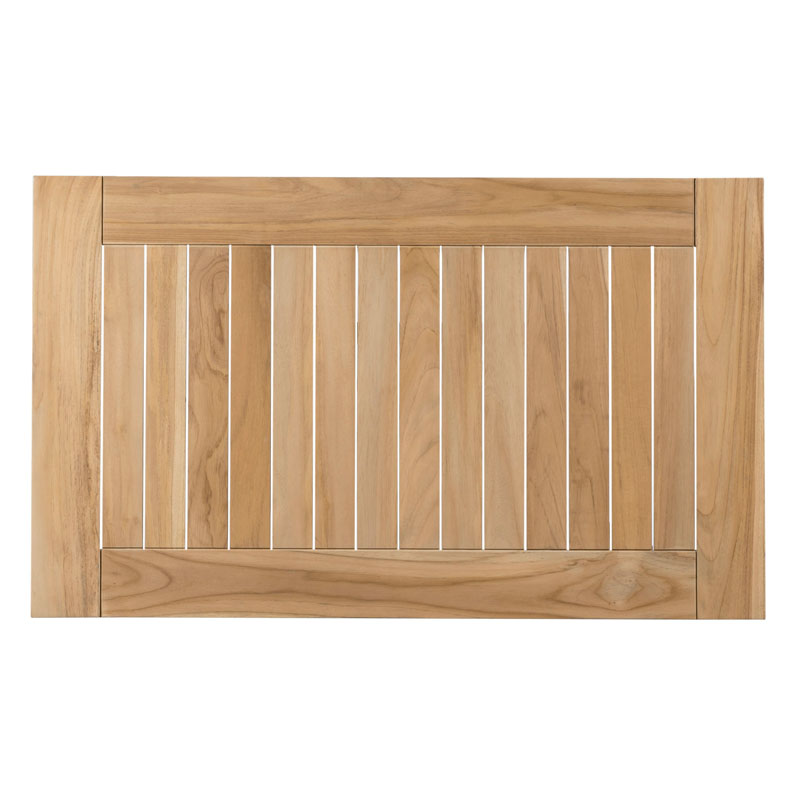 A handsome low table designed for outdoor purposes has a rectangular slatted teak wood top elevated on a metal base with squared legs accented by a graceful support arch.Material: Teak solids with powder coated aluminum