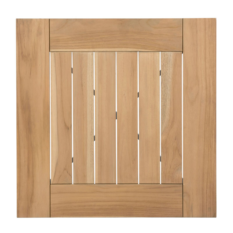 A handsome side table designed for outdoor purposes has a square slatted teak wood top elevated on a metal base with squared legs accented by a graceful support arch.Material: Teak solids with powder coated aluminum