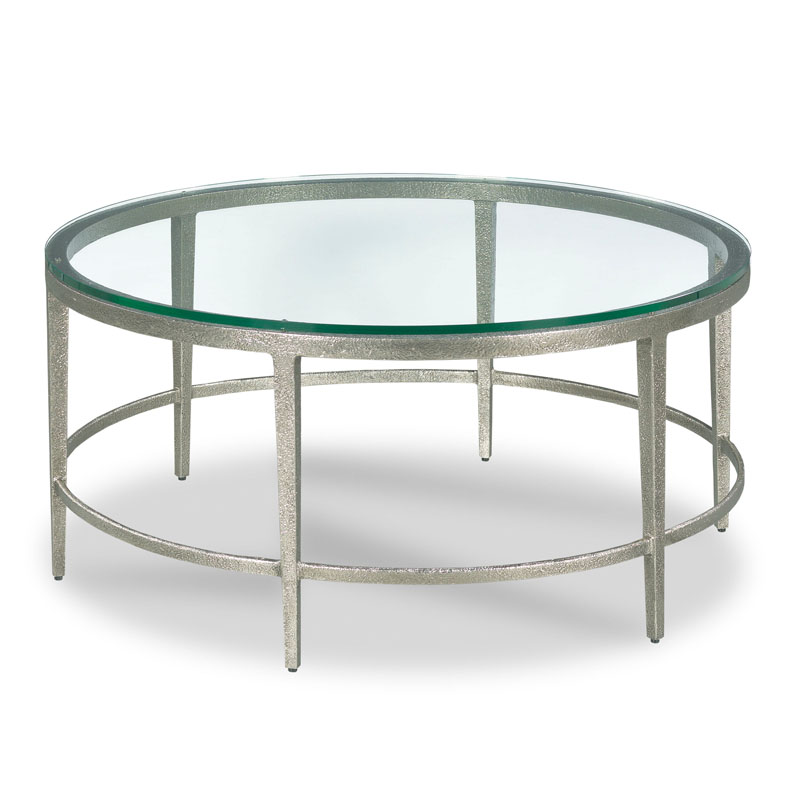 The design was influenced by the modern styles of the fashionable cosmopolitan Bayswater area of London. Slender tapering legs elevate a circular frame and round 1/2" thick glass top.Material: Textured silver metal with 1/2" glass top