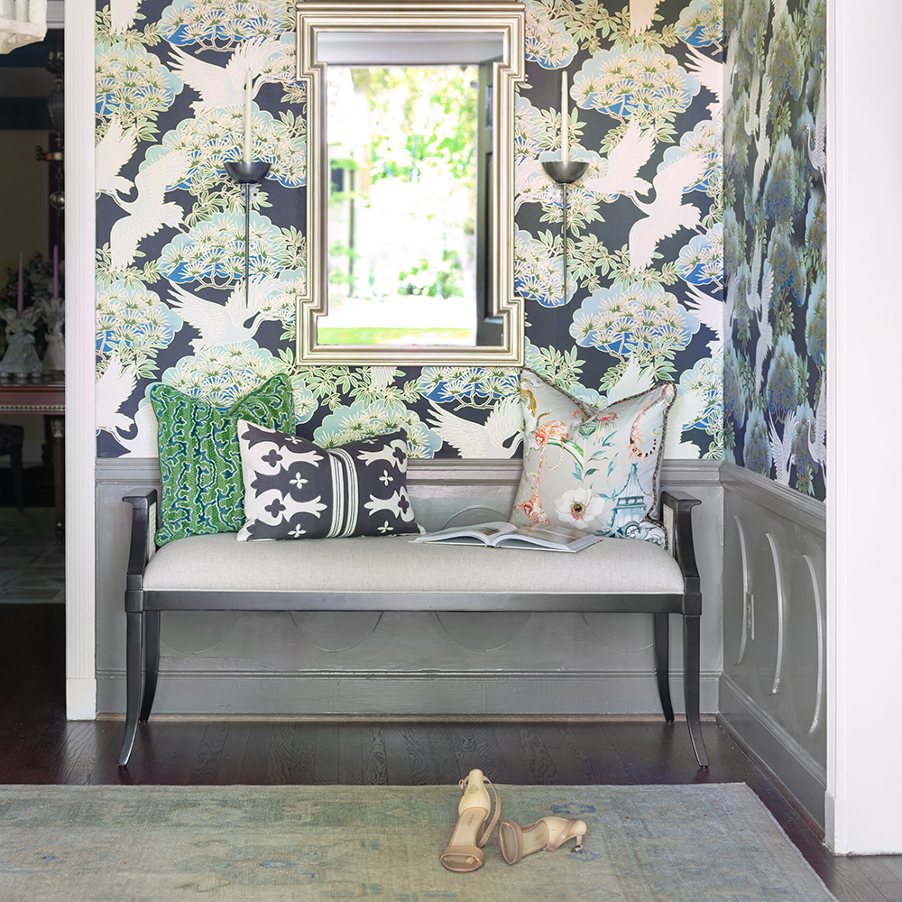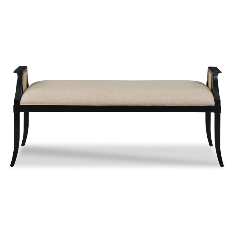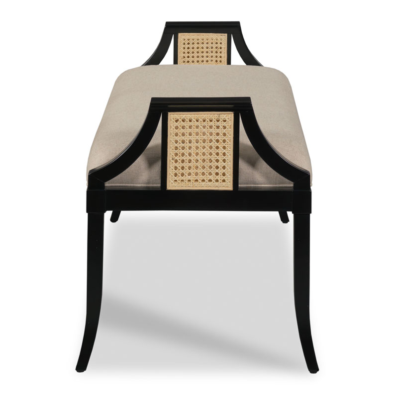 19th century English craftsmen drew inspiration from Roman and Egyptian styles of the period, this style became known as Regency. An upholstered seat rests over a rectangular wood frame that is parted by shaped arms that are fitted with open traditional cane. The bench is elevated on flared tapering corner posts.Material: Hardwood solids and natural cane