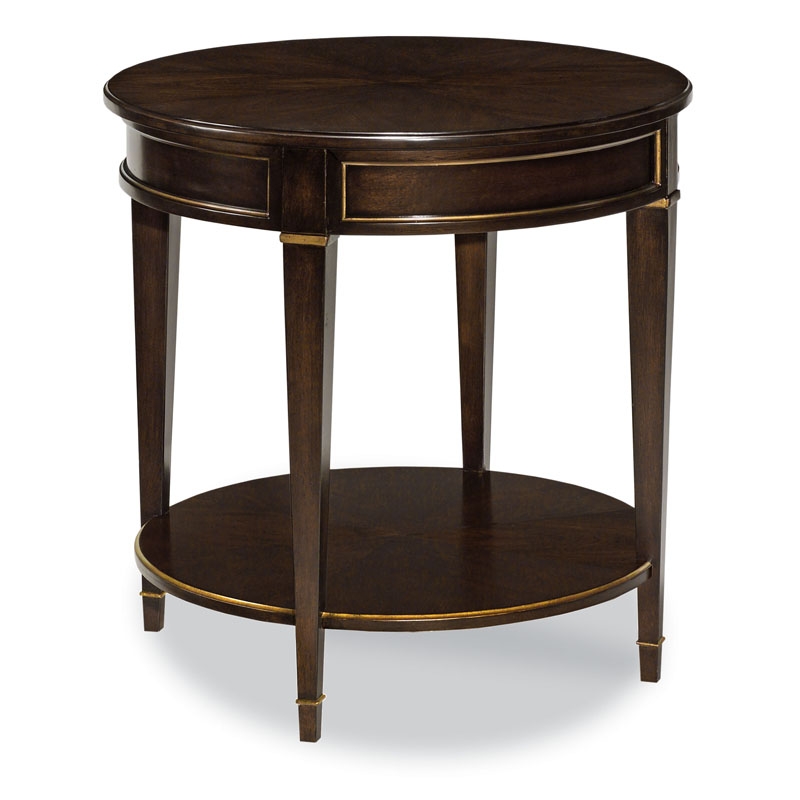 A wonderful table inspired by 19th Century Italian originals. The molded round top rests over curved apron rails, accented by gilt detailing. The table is elevated by square tapering posts and joined by a low shelf.Material: Hardwood solids and mahogany veneer